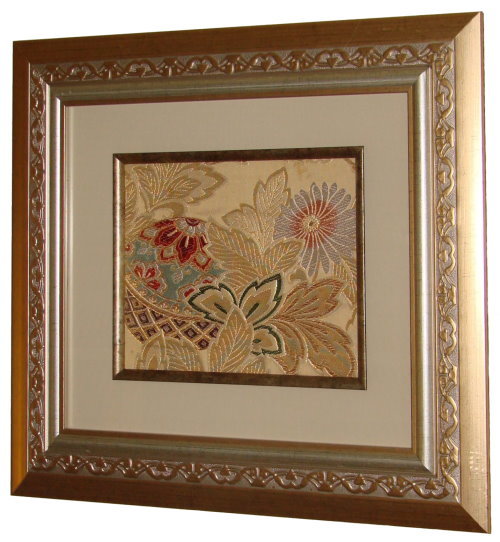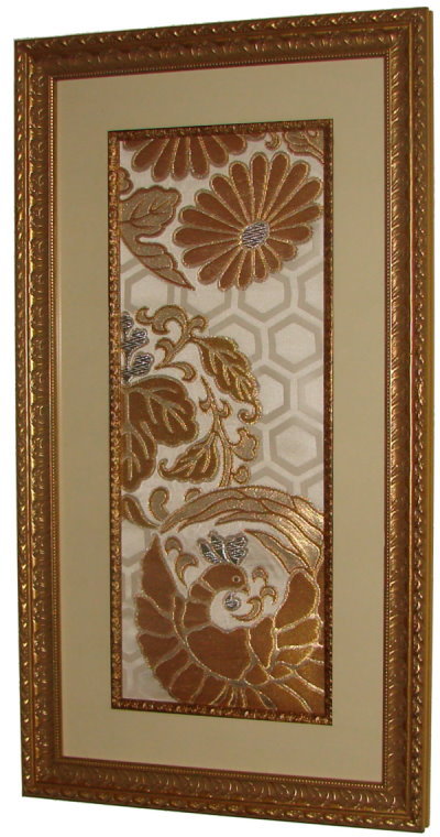 The art of silk fabrics often results in beautiful, elegant and interesting patterns which are worthy of note as individual pieces. These are often fragments of larger pieces or have a central design motif which is a picture in itself. Below are a few of the fabric pieces we have creatively matted and framed for your selection.