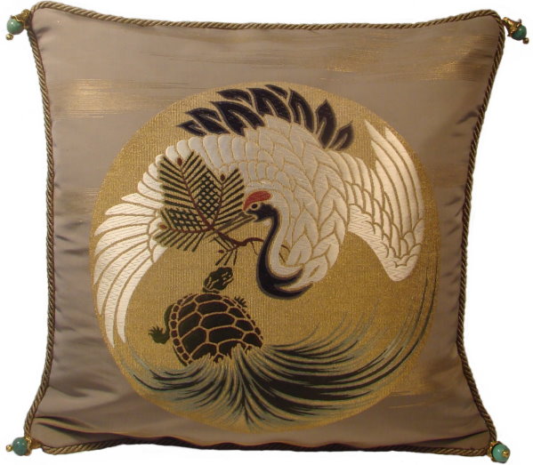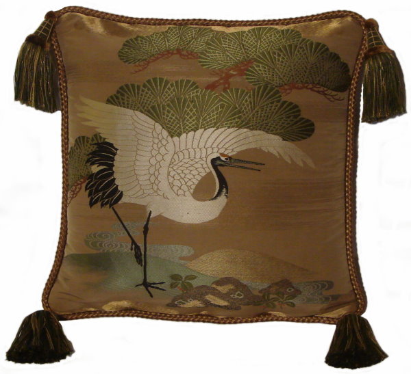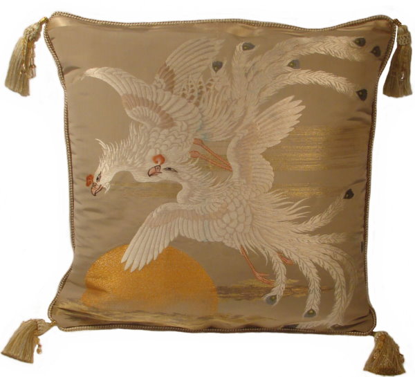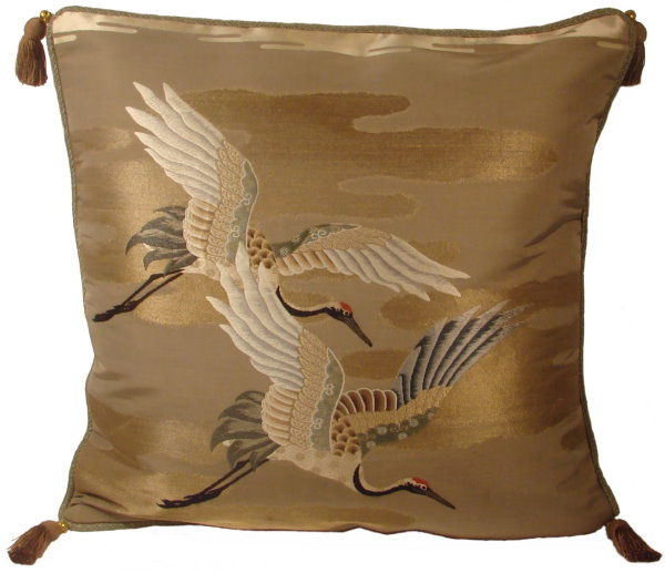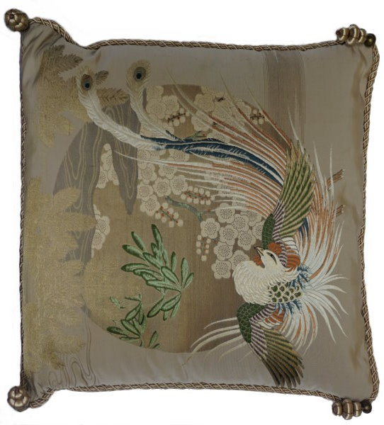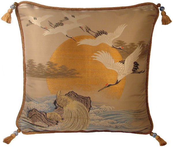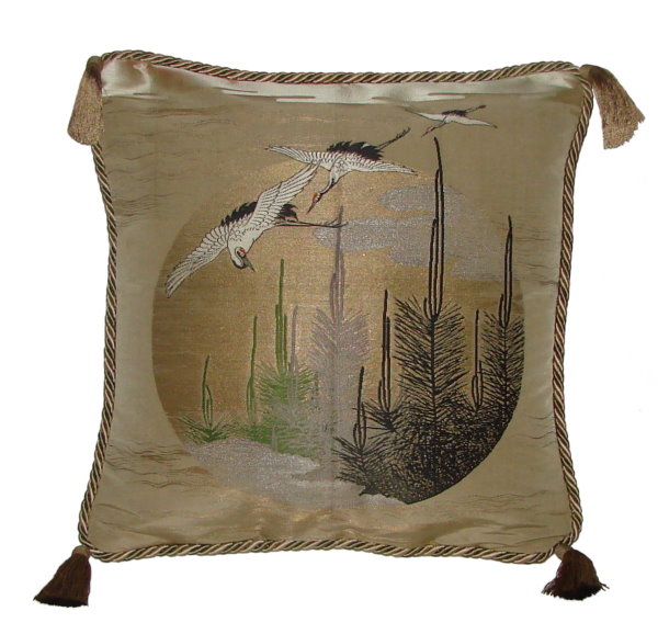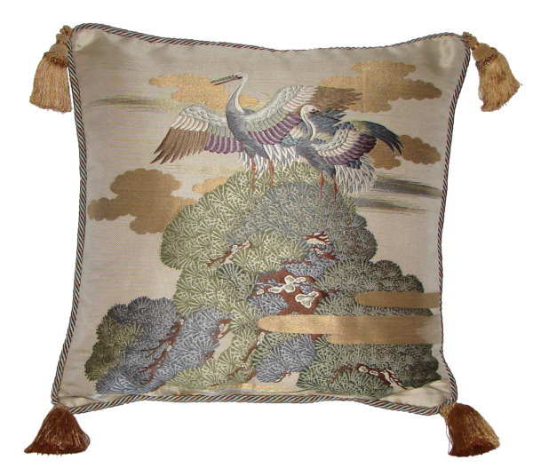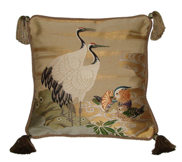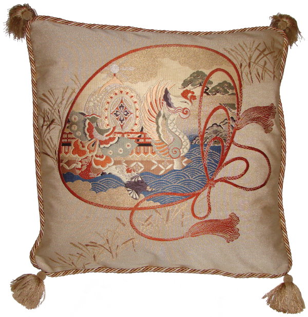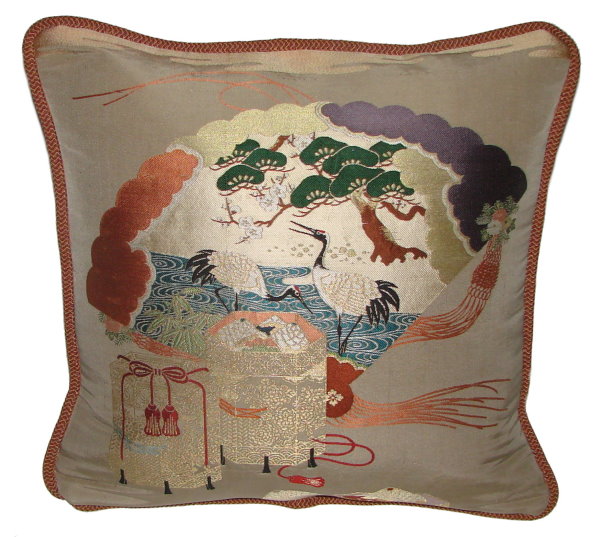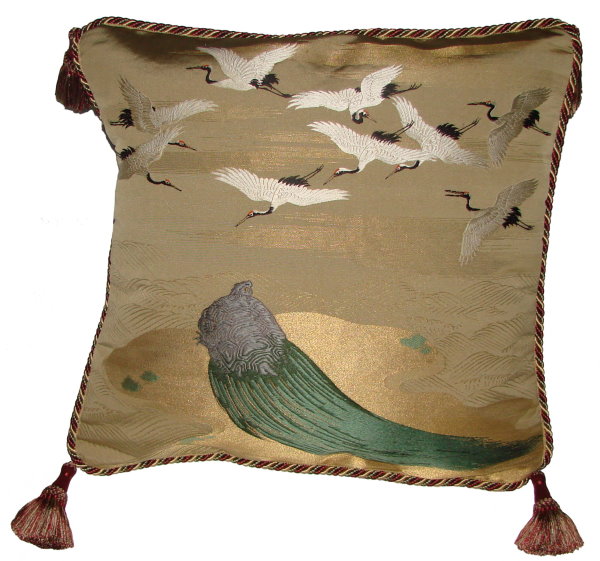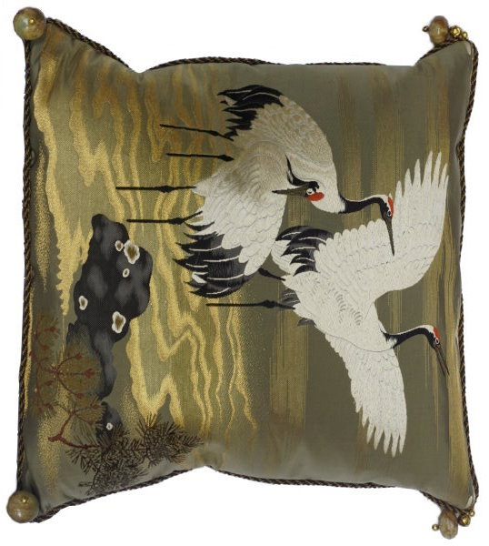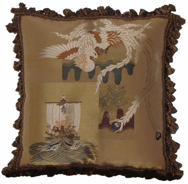 There are several kinds of Fukusa but not all are appropriate to be used in the construction of pillows. The ones we use are traditionally used by the Japanese to cover an important ceremonial gift during its presentation. They are a woven square of silk or silk and metallic fabric and are hand woven with intricate loom embroidery. In addition, some of these Fukusa also have hand embroidered highlights. Fukusa that are suitable for pillows and are in acceptable condition are becoming increasingly scarce and hard to find. And as Fukusa become more scarce, the prices have also increased dramatically. Fukusa are a beautiful, disappearing piece of Japanese cultural history.
