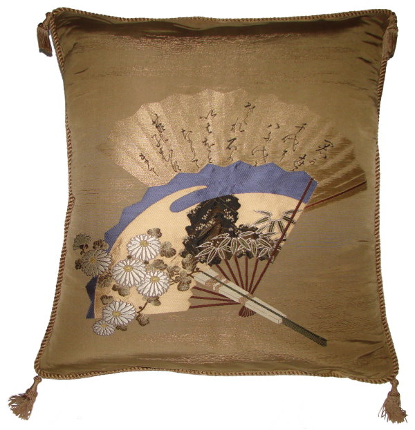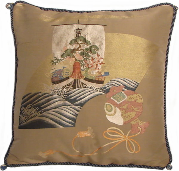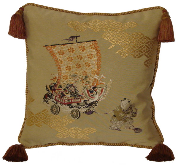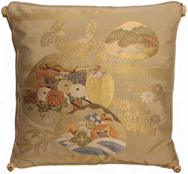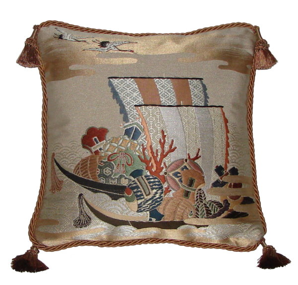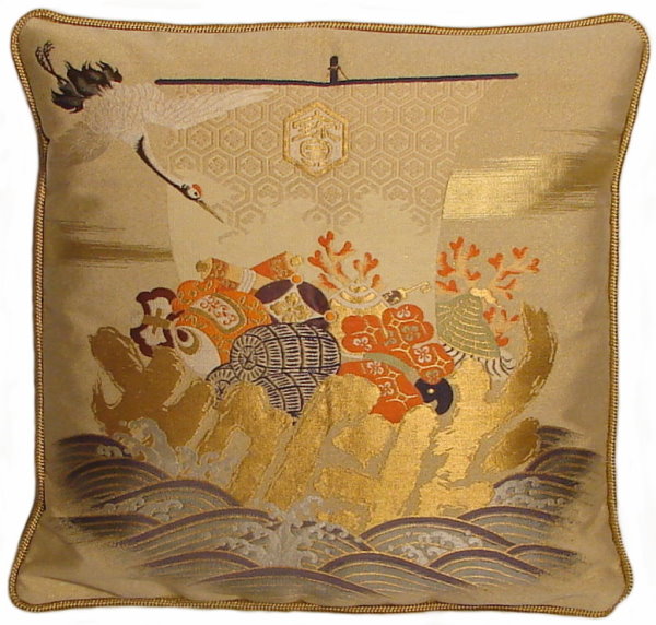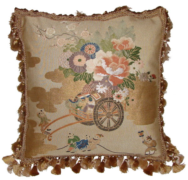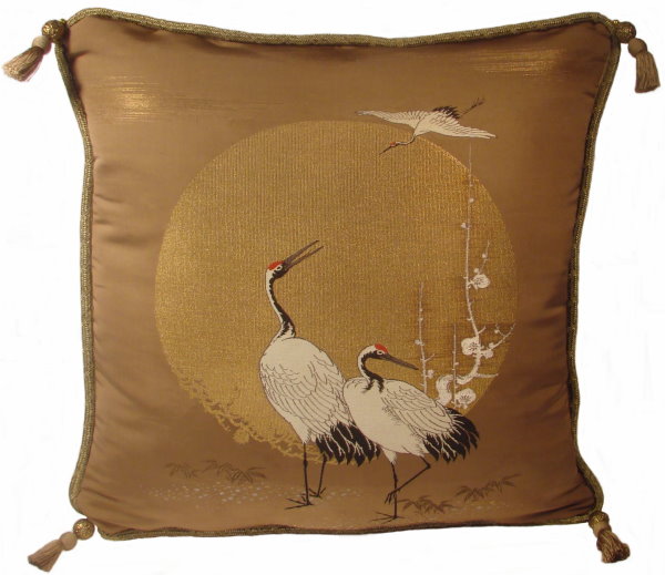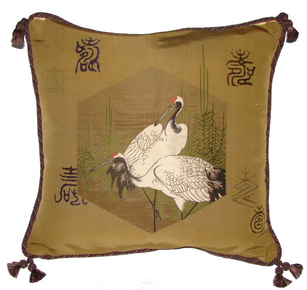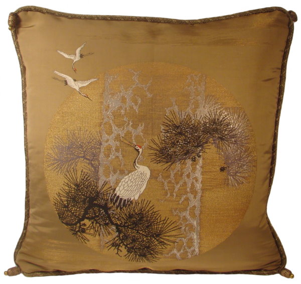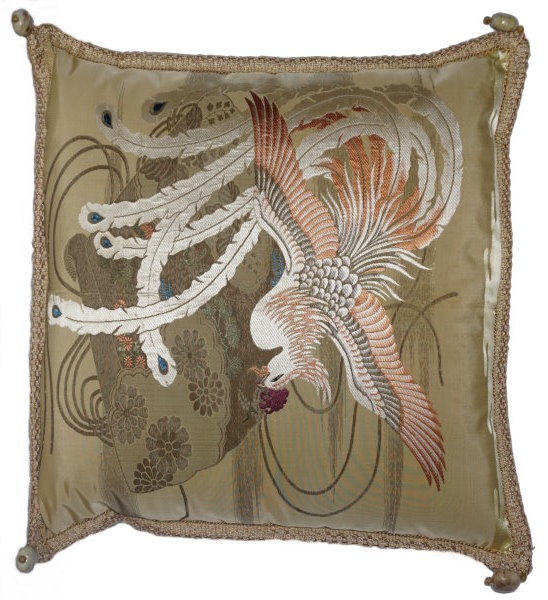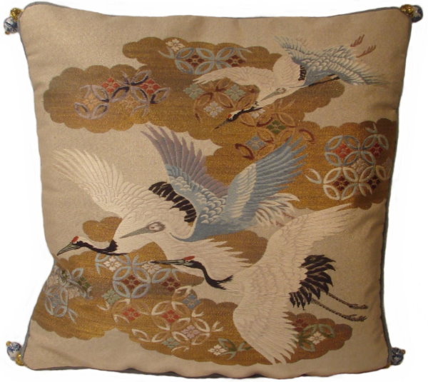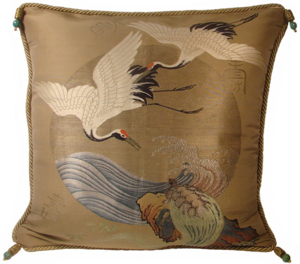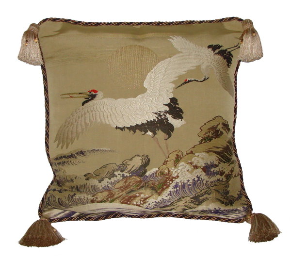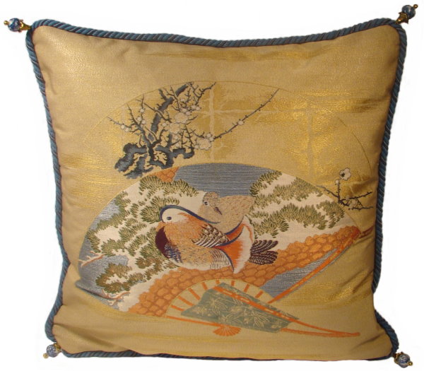 There are several kinds of Fukusa but not all are appropriate to be used in the construction of pillows. The ones we use are traditionally used by the Japanese to cover an important ceremonial gift during its presentation. They are a woven square of silk or silk and metallic fabric and are hand woven with intricate loom embroidery. In addition, some of these Fukusa also have hand embroidered highlights. Fukusa that are suitable for pillows and are in acceptable condition are becoming increasingly scarce and hard to find. And as Fukusa become more scarce, the prices have also increased dramatically. Fukusa are a beautiful, disappearing piece of Japanese cultural history.