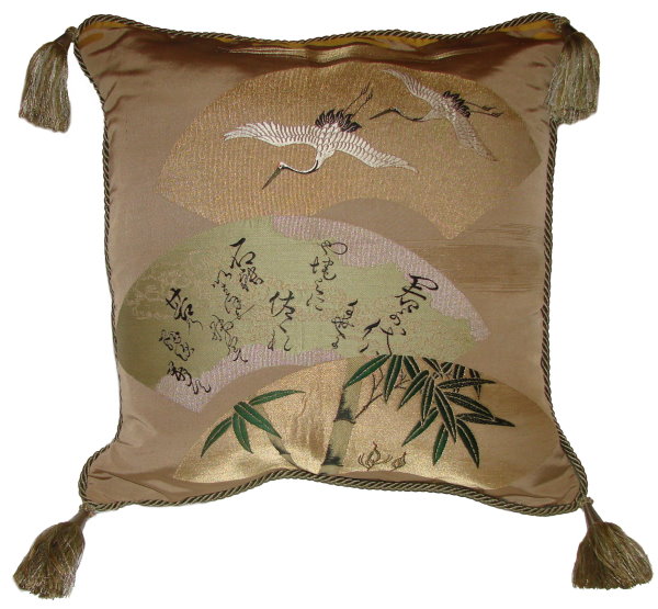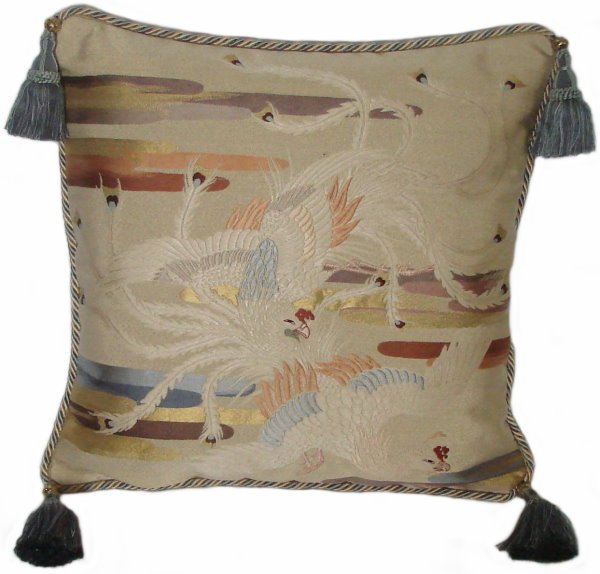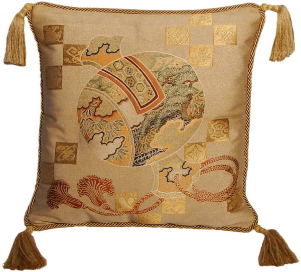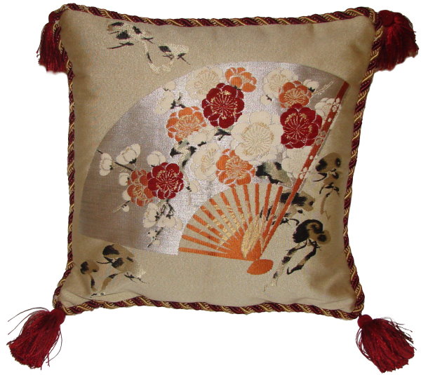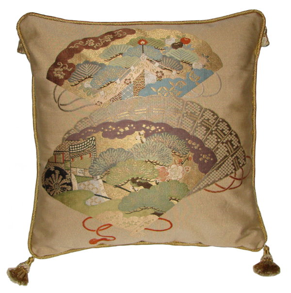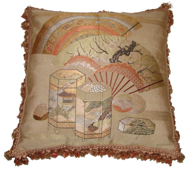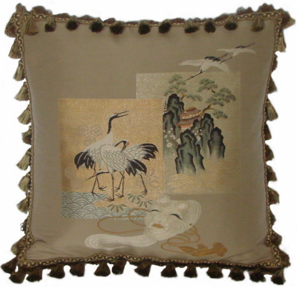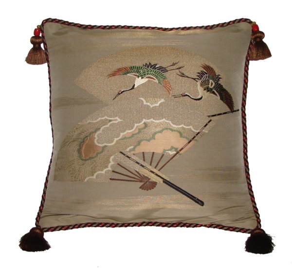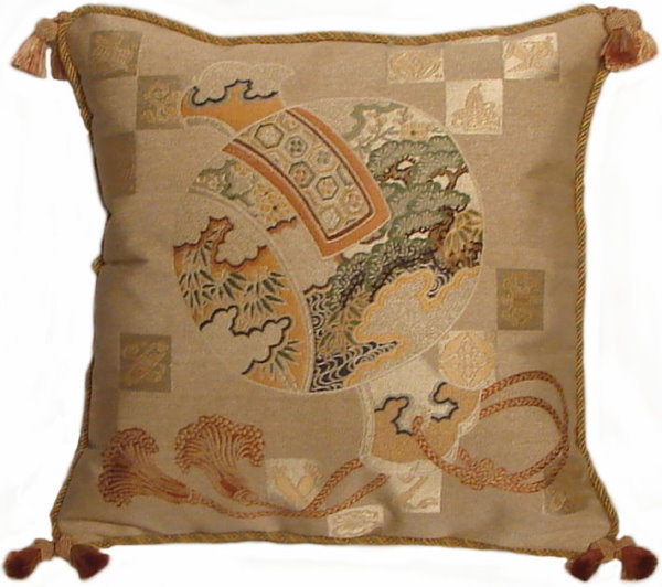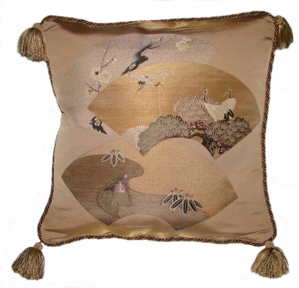 Our Fukusa pillows are all one-of-a-kind pillows with backing fabrics, trims and tassels individually selected for each pillow. All of our pillows are filled with feather/down inserts. The Fukusa pillows we offer are made using mostly antique or vintage (around 50 to 100 years old) gift coverings. These pillows are generally 24" x 24" or 20" x 20" but ocasionally are a smaller size.