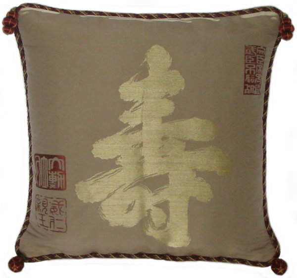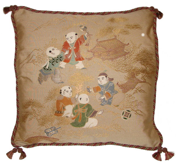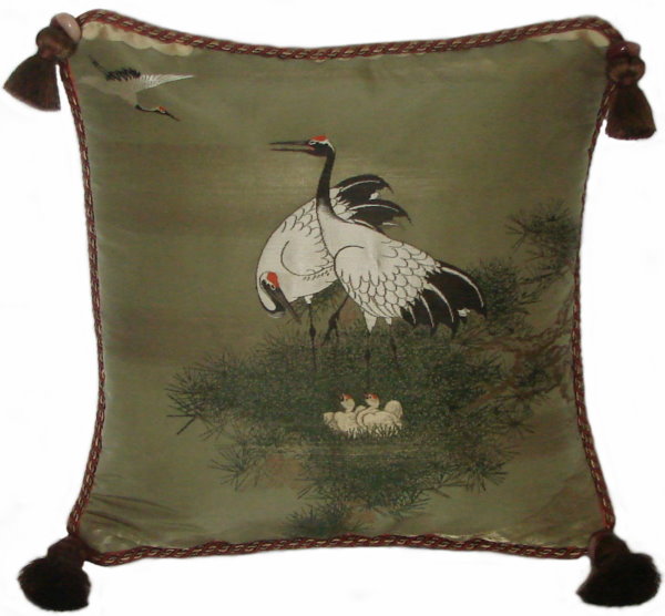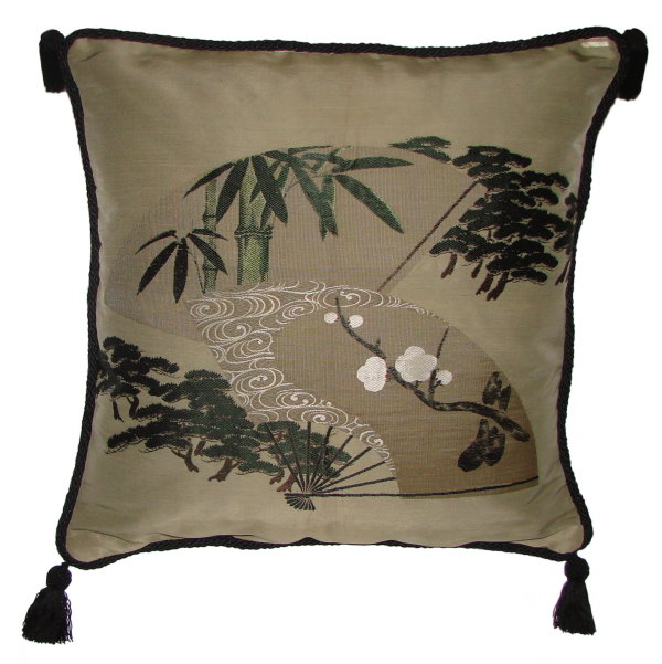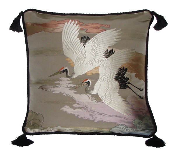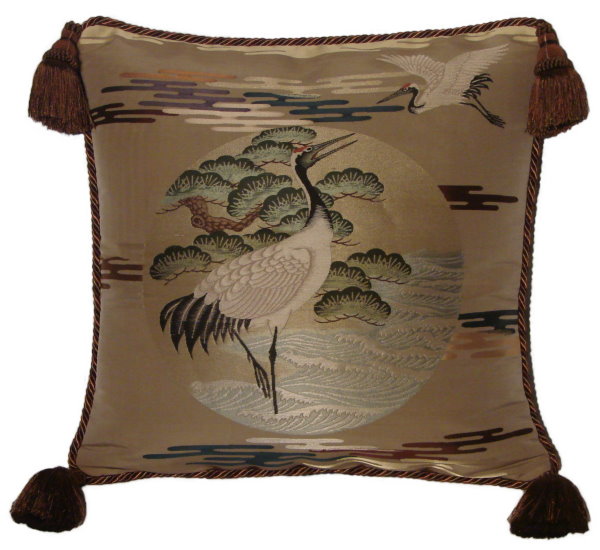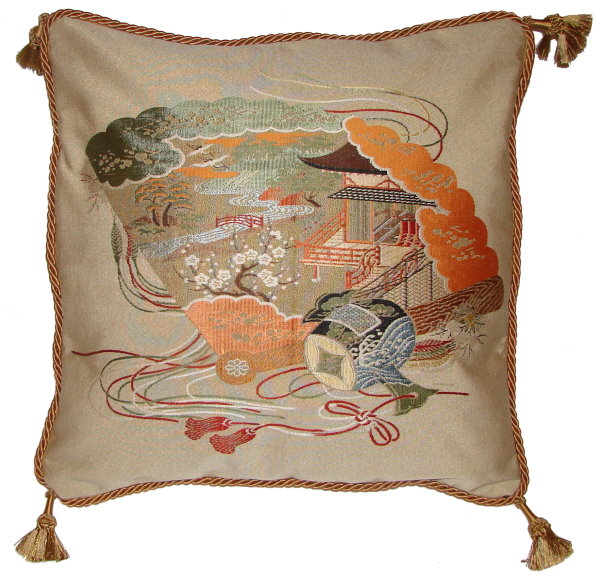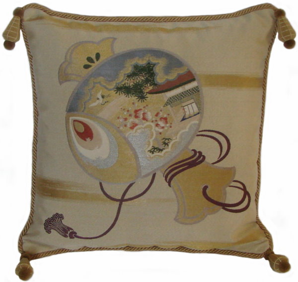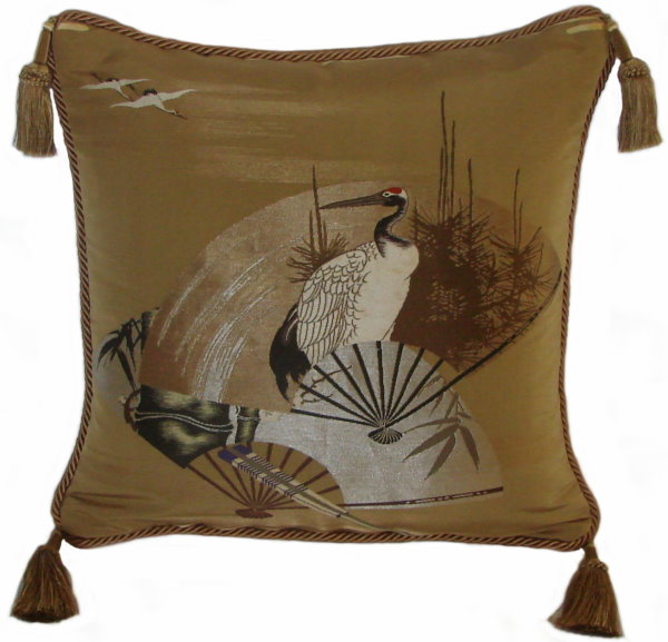 Our Fukusa pillows are all one-of-a-kind pillows with backing fabrics, trims and tassels individually selected for each pillow. All of our pillows are filled with feather/down inserts. The Fukusa pillows we offer are made using mostly antique or vintage (around 50 to 100 years old) gift coverings. These pillows are generally 24" x 24" or 20" x 20" but ocasionally are a smaller size.