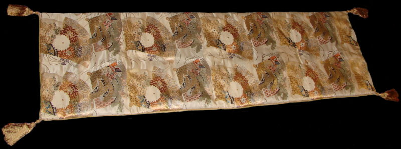 Our throws are made from vintage, modern and antique obi with dupioni silk, silk taffeta or microsuede backing, decorative cording and tassels or bouillon fringe. The throws are available in queen size which are approximately 24” - 26” wide by 86” long, plus the tassels or fringe; and in king size 24” - 31” wide by 106” long, plus the tassels or fringe.